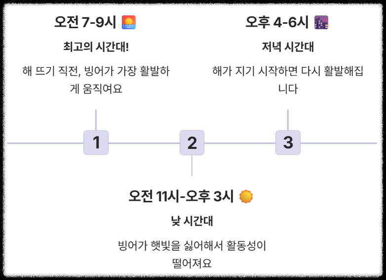 - 시간대: 빙어는 햇빛을 싫어해서 해가 뜨기 직전 (오전 7~9시)이나 해가 지기 시작할 때 (오후 4~6시)에 활발하게 움직여요. 오전 낚시가 성공률이 가장 높습니다.