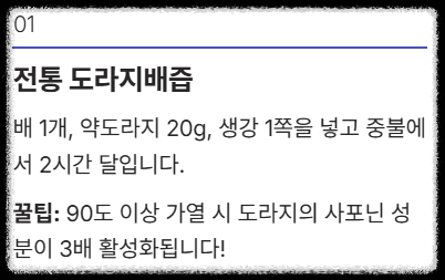 - 전통 도라지배즙: 배 1개, 약도라지 20g, 생강 1쪽을 넣고 중불에서 2시간 달입니다.