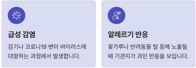 - 알레르기 반응: 꽃가루나 반려동물 털 등에 노출될 때 기관지가 과민 반응을 보입니다.