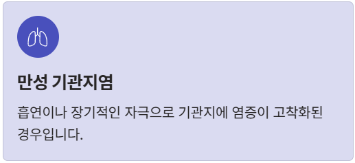 - 만성 기관지염: 흡연이나 장기적인 자극으로 (COPD 환자13%↑)기관지에 염증이 고착화된 경우입니다.