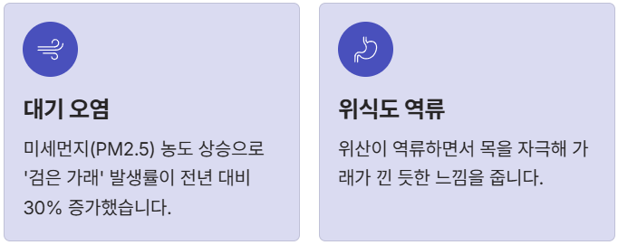 - 대기 오염: 2025년 들어 미세먼지(PM2.5) 농도 상승으로 인해 '검은 가래' 발생률이 전년 대비 30%나 증가했습니다.