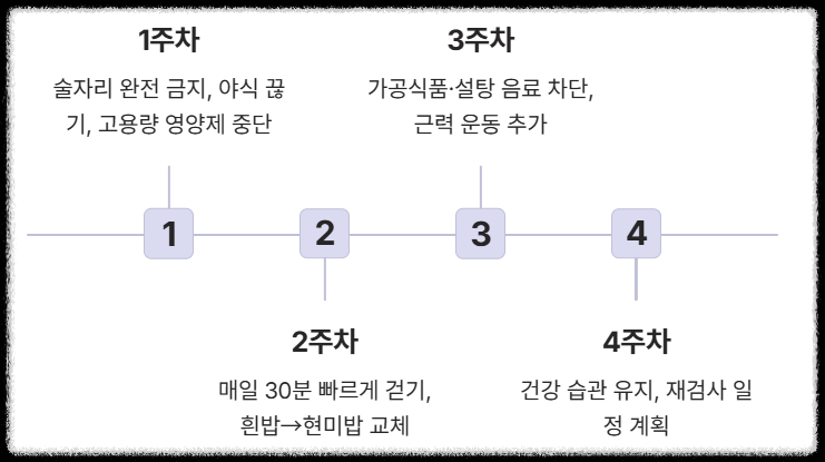 | 4주차 | 새로운 건강 습관을 유지하고, 30일 후 병원에서 재검사 시기 계획하기. |