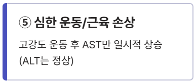 AST는 근육에도 존재하기 때문에, 건강 검진 직전에 무리한 고강도 운동(웨이트 트레이닝, 마라톤 등)을 한 경우 일시적으로 AST 수치만 높게 나올 수 있습니다. 이 경우 ALT는 정상이거나 약간만 상승합니다.