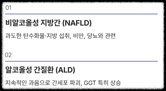 간수치 상승의 가장 흔한 원인 중 하나입니다. 과도한 탄수화물/지방 섭취, 비만, 당뇨병, 고지혈증 등 대사증후군과 관련이 깊습니다. 지방간은 간에 지방이 5% 이상 쌓인 상태를 말하며, 심해지면 간염(NASH)으로 발전할 수 있습니다.