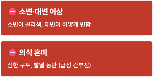 - ⛔ 의식이 혼미해지거나 심한 구토, 발열이 동반될 때 (급성 간부전 가능성).