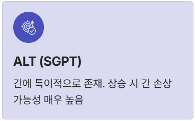 * AST (SGOT): 주로 간에 있지만, 심장, 신장, 근육에도 존재합니다. 따라서 AST 수치만 단독으로 높을 경우, 간 외적인 근육 손상(심한 운동, 외상 등)도 함께 고려해야 합니다. * ALT (SGPT): AST보다 간에 특이적으로 존재하는 효소입니다. 따라서 ALT가 높다면 간 손상일 가능성이 매우 높습니다.