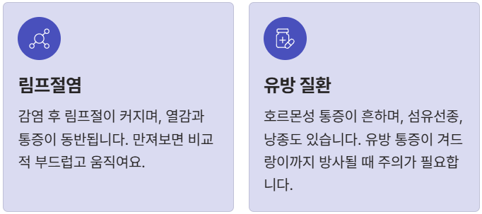 - ② 유방 질환: 생리 주기와 관련된 호르몬성 통증이 흔하며, 섬유선종, 낭종도 있어요. 특히, 유방 통증이 겨드랑이까지 방사될 때 주의가 필요합니다.