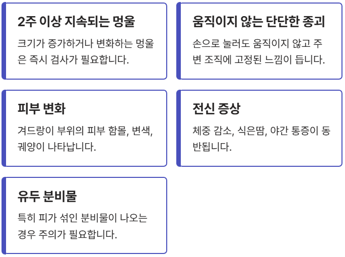 - 2주 이상 지속되거나 크기가 증가하는 멍울