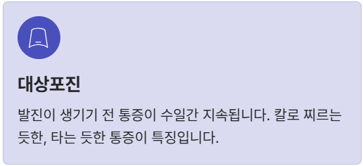| 통증 양상 | 의심 질환 | 권장 대처법 |