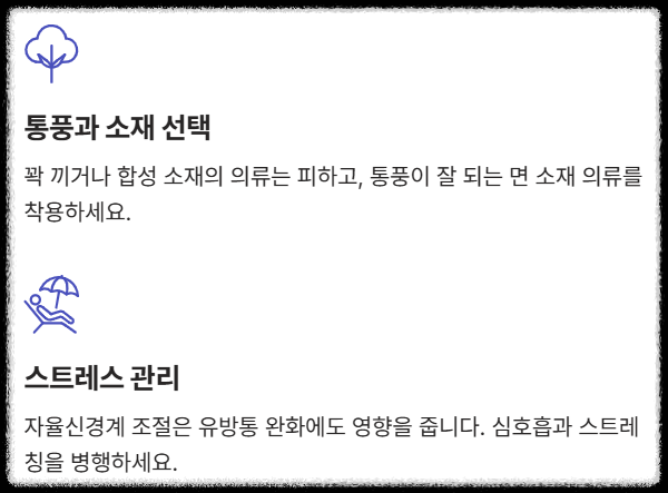 - 통풍과 소재 선택: 꽉 끼거나 합성 소재의 의류는 피하고, 통풍이 잘 되는 면 소재 의류를 착용하는 것이 피부 질환 예방에 필수입니다.
