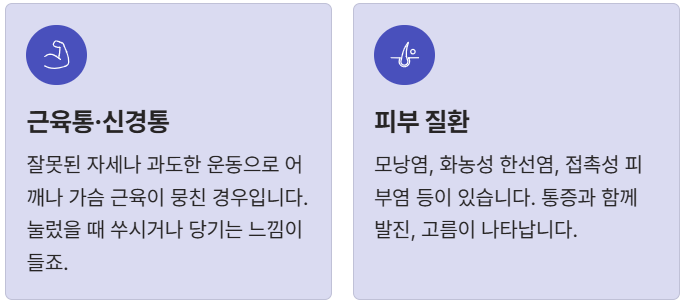 - ③ 근육통·신경통: 잘못된 자세(거북목)나 과도한 운동으로 어깨나 가슴 근육이 뭉친 경우예요. 눌렀을 때 쑤시거나 당기는 느낌이 들죠.