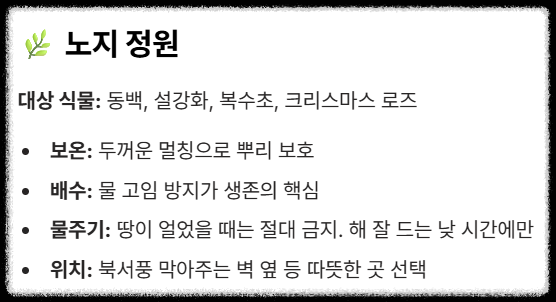 | 노지 정원 (동백, 설강화 등) | ① 두꺼운 멀칭: 낙엽, 짚, 부직포 등으로 땅을 두껍게 덮어 뿌리 보온(특히 서리가 내리기 전). ② 배수 관리: 얼었다 녹는 과정에서 뿌리가 썩지 않도록 배수가 잘 되는 환경 유지. ③ 늦가을 충분한 물주기: 땅이 얼기 전까지 물을 흠뻑 주어 식물이 건조해지는 것을 방지. |