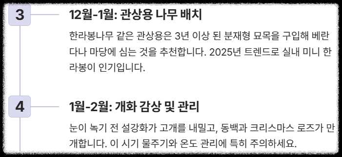 | 공통 (비료/전정) | ⑦ 겨울철 비료 금지: 휴면기에는 비료를 주면 안 됩니다. ⑧ 전정 최소화: 가지치기는 휴면기가 끝나는 늦겨울~초봄에 약하게만 진행하세요. |