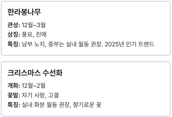 | ⑧ | 크리스마스 수선화 | 12월 ~ 2월 | 자기 사랑, 고결 | 중 (실내 화분 월동 권장) |
