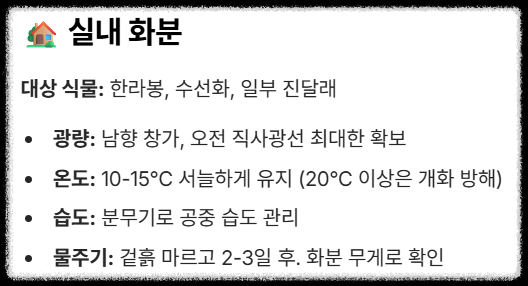 | 실내 화분 (한라봉, 수선화) | ④ 남향 창가 배치: 최대한 햇빛을 많이 받을 수 있는 곳에 배치 (오전 직사광선 선호). ⑤ 저온 유지: 너무 따뜻한 실내(20°C 이상)는 개화에 방해되므로 10~15°C 정도의 서늘한 온도 유지. ⑥ 공중 습도: 난방으로 건조해지기 쉬우므로 분무기로 공중 습도 관리. |