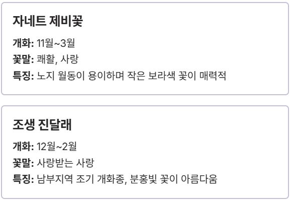| No. | 꽃 종류 | 대표 개화 시기 | 꽃말 (주요 키워드) | 내한성 |