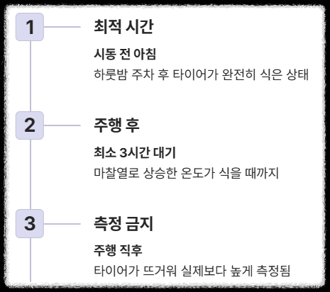 - 만약 주행 후 측정해야 한다면, 최소 3시간 이상 주차하여 타이어가 완전히 식은 후 측정해야 합니다.