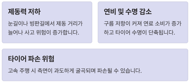 - **연비 및 수명 감소:** 구름 저항이 커져 연료 소비가 증가하고, 타이어 측면에 과도한 열이 발생해 타이어 수명이 줄어듭니다.