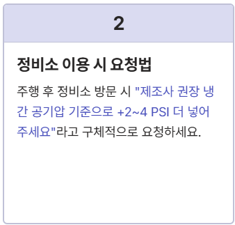 - 정비소 이용 시 '냉간' 주입 요청 🗣️차량을 운행한 후 정비소에 도착했다면 타이어가 이미 뜨거워진 상태입니다. 이럴 경우 정비사에게 **"주행으로 인해 공기압이 상승했으니, 제조사 권장 냉간 공기압 기준으로 +2~4 PSI 정도 더 넣어주세요"**라고 구체적으로 요청하는 것이 좋습니다. 전문가들은 이 미묘한 차이를 이해합니다.
