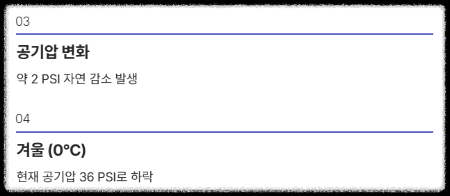 - 2. 공기압 하락 예측: 약 1 PSI/10°C × 2 = **2 PSI 하락**