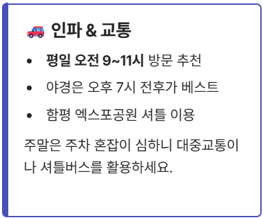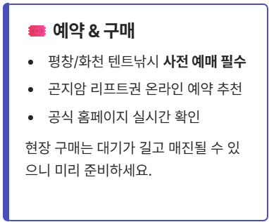 | **인파/교통** | **평일 오전 9시~11시** 방문 or **폐장 1시간 전** 공략 | 함평 축제는 주차 혼잡 심각. 함평 엑스포공원 셔틀 이용 추천. 곤지암 스키장 **개장 직후 리프트 대기** 피할 것. |