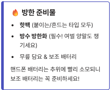 | **준비물 (방한)** | 🔥핫팩(붙이는/흔드는), 방한화(방수 필수), 무릎 담요 | 스키장/낚시 축제 시 **여벌 양말**은 필수. 핸드폰 배터리 소모가 빠르니 보조 배터리 준비! |