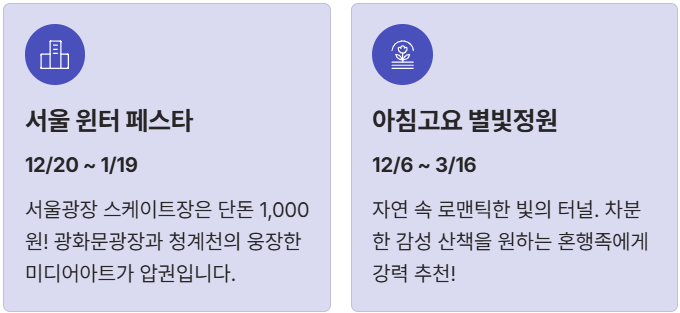 | 서울 윈터 페스타 | 12/20 ~ 1/19 | 도심 속 빛, 스케이트 | 모두 (특히 뚜벅이) |