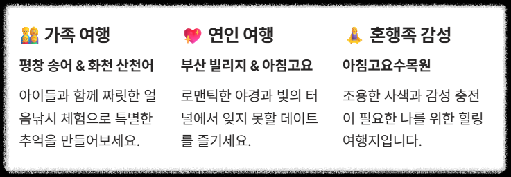 - 🧘♀️ 혼행족/감성: 아침고요수목원 & 제주 얼음박물관+겨울페스티벌 (조용한 사색과 감성 마켓)