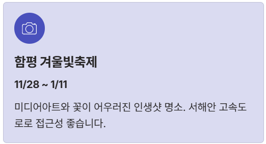 | 함평겨울빛축제 | 11/28 ~ 1/11 | 미디어아트, 인생샷 | 사진 러버, 가족 |