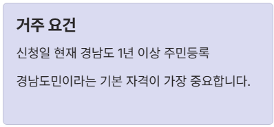 | 거주 요건 | 신청일 기준 경남 1년 이상 거주 | 주민등록 초본 |