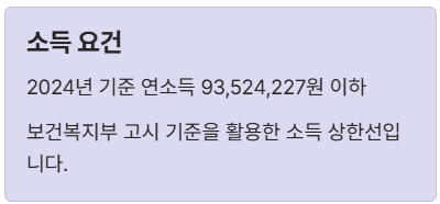 | 소득 요건 | 연소득 93,524,227원 이하 (2024년 기준) | 소득금액증명원 |