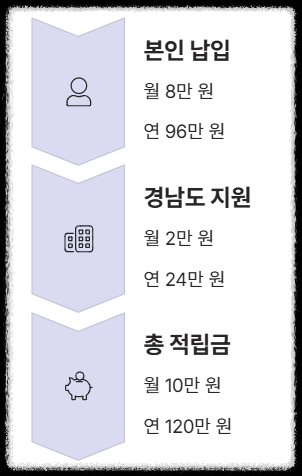 **경남도민연금**은 도민이 개인형 퇴직연금(**IRP**) 계좌에 연간 96만 원(월 8만 원)을 납입 시, 경남도에서 8만 원당 2만 월 지원하여 연 최대 24만 원 적립하는 방식입니다. 최대 10년(120개월) 지원 시 총 240만 원을 받을 수 있습니다.