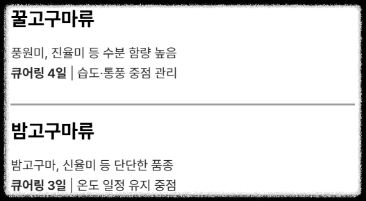 | 꿀**고구마**류 | 풍원미, 진율미 | 4일 | 습도 조절 및 **통풍** |
