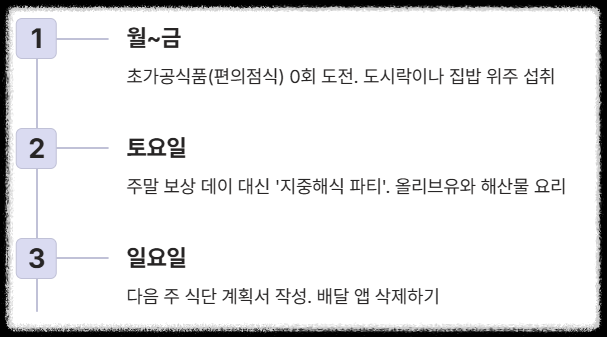- 일: 다음 주 식단 계획서 작성. 배달 앱 삭제하기.