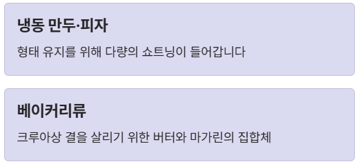 - 냉동 만두/피자: 형태 유지를 위해 다량의 쇼트닝이 들어갑니다.