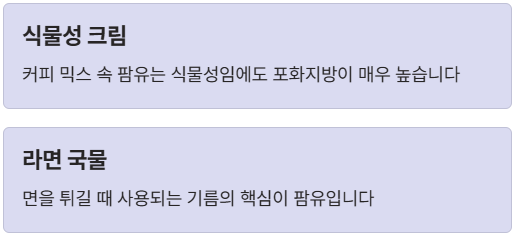 - 식물성 크림(커피 믹스): 팜유는 식물성임에도 포화지방이 매우 높습니다.