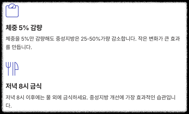 | 50대 여성 B님 | 중성지방 280 → 120 | 저녁 8시 이후 금식 + 야식 단절 |