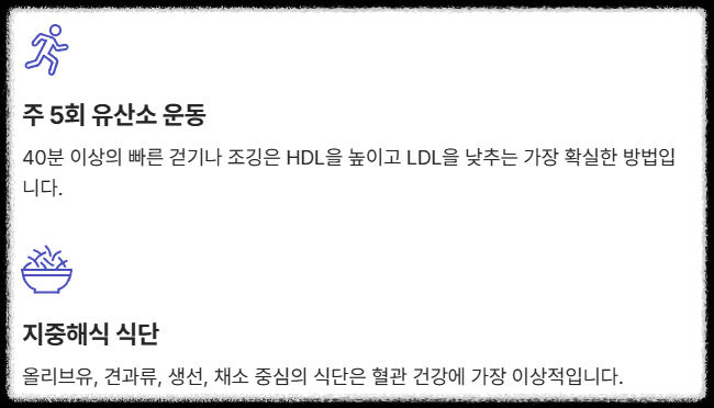 | 40대 남성 A님 | LDL 150 → 110 | 주 5회, 40분 빠른 걷기 병행 |