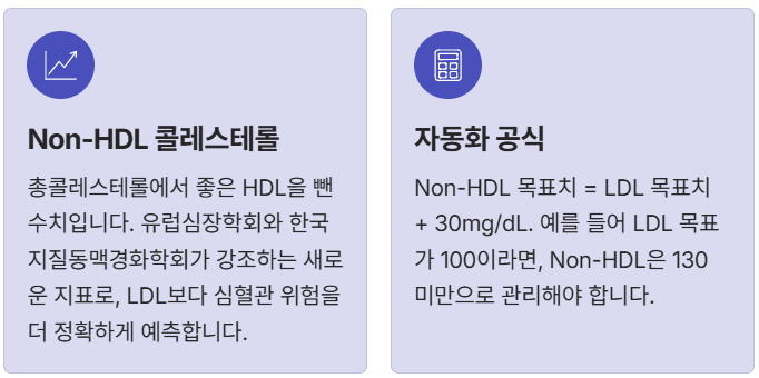 최근 유럽심장학회(ESC/EAS)와 한국 지질동맥경화학회의 지침에서 강조하는 것은 바로 Non-HDL 콜레스테롤입니다. 이는 총콜레스테롤에서 좋은 콜레스테롤(HDL)을 뺀 수치로, LDL보다 심혈관 위험을 더 정확하게 예측한다고 알려져 있습니다.