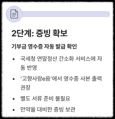 - 기부를 완료하면 기부금 영수증이 자동으로 발급됩니다. 가장 좋은 점은 이 기부 내역이 국세청 **연말정산 간소화 서비스에 자동 반영된다**는 사실입니다. 별도로 서류를 챙길 필요가 없지만, 만약을 대비하여 '고향사랑 e음'에서 기부금 영수증 사본을 출력해 두는 것을 권장합니다.