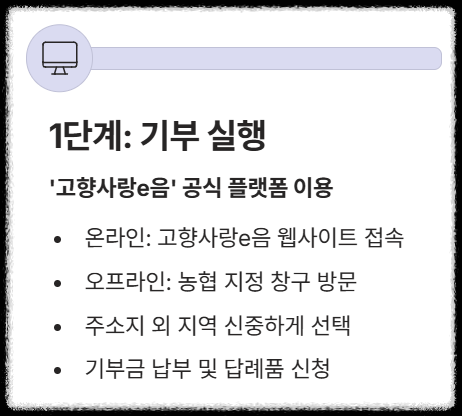 - 기부는 반드시 **'고향사랑e음'** 공식 온라인 시스템 또는 지정된 금융기관(농협) 창구를 통해 진행해야 합니다. 특히 온라인 플랫폼을 이용하면 기부부터 답례품 신청까지 한 번에 처리할 수 있어 편리합니다. 주소지 외 지역을 신중하게 선택하고 기부금을 납부하세요.