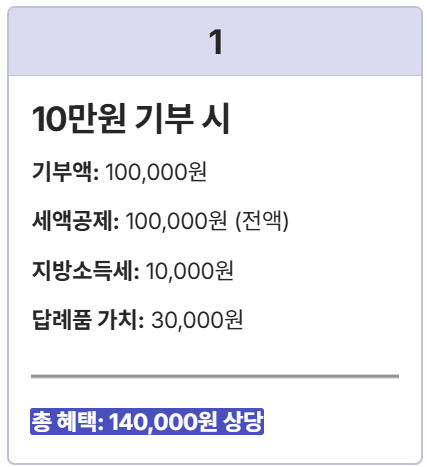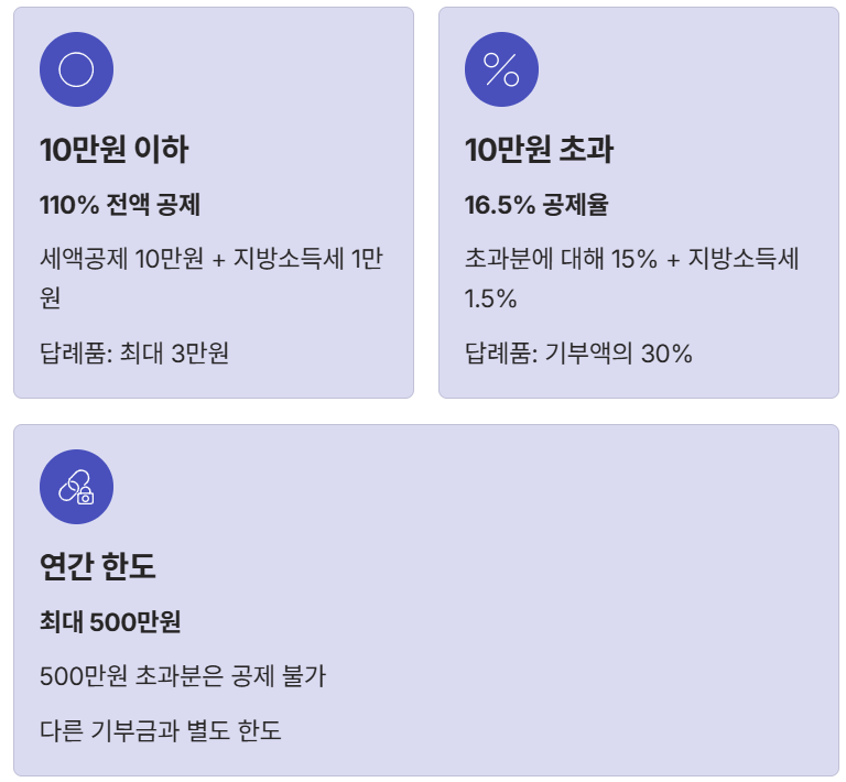 | 10만 원 이하 | 110% (전액) | 최대 3만 원 상당 (기부액의 30%) |