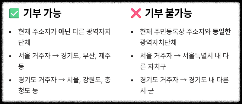 - 불가능 (주의!): 현재 서울에 거주하는 분이 서울특별시 내 다른 자치구에 기부 (동일 광역자치단체 내 기부 불가)