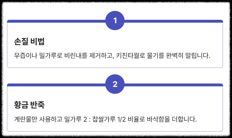 - **맛술 (청주)**: 계란물에 맛술(청주)을 1/2 작은술 정도 넣어주면 **굴**의 잡내를 확실하게 잡아주고 계란물의 풍미를 높여줍니다.