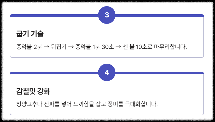 - **뒷면 굽기**: 뒤집은 후 약 1분 30초 정도 굽고, 마지막 10초는 센 불로 잠시 올렸다 빼주세요. 이 '마지막 10초'가 남은 수분을 날려버려 **겉바속촉**을 완성하는 비법입니다!