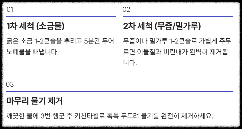 - **2차 세척 (무 즙/밀가루)**: 흐르는 물에 가볍게 헹군 뒤, **무 즙** 또는 **밀가루** 1~2 큰술을 넣어 가볍게 주무르듯이 씻어주세요. 이 방법이 이물질과 비린내를 흡착하는 데 탁월합니다.
