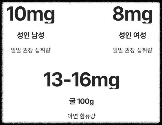 성인 남성의 아연 일일 권장 섭취량은 10mg, 여성은 8mg입니다. 신선한 굴 100g(약 5~7개)에는 보통 13~16mg의 아연이 함유되어 있어, 몇 알만 먹어도 하루 권장량을 쉽게 채울 수 있습니다.