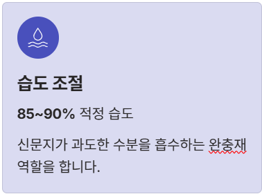 - 5~15°C 서늘한 곳: 냉장고는 피하고, **베란다나 다용도실**의 그늘진 곳에 층층이 신문지를 깔고 보관한다.