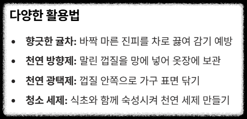 - 천연 방향제: 껍질을 말려 망에 넣어 옷장이나 신발장에 두면 은은한 향이 퍼져요.