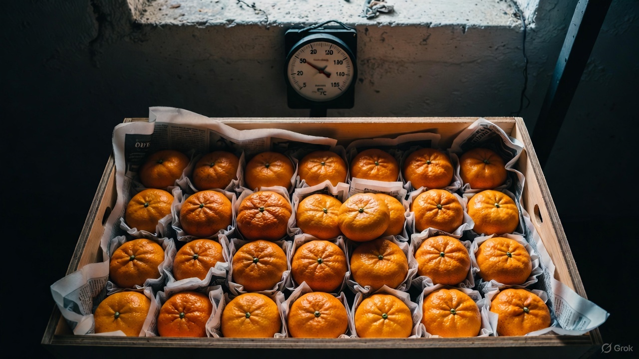 - 신문지 개별 포장: 귤을 신문지로 하나씩 감싸 **습도를 조절**하고, 구멍 뚫린 봉투에 느슨하게 넣어 통풍을 확보한다.